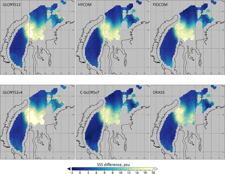 Salinity, however, shows significantly larger discrepancies. All products are too salty where measurements indicate a strong freshwater plume from the Ob and Yenisei. In other words, the models underestimate the extent and reach of the freshened waters from these great Siberian rivers. On maps, this appears as a “salty tongue” extending north and east from the river mouths — in satellite data it is wider and reaches farther into the sea than in the simulations (Figure 1).